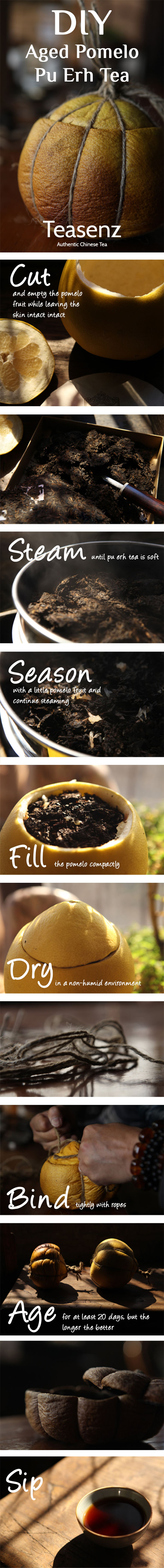 Learn how to let pu erh tea age in the skin of a pomelo and do it yourself! See the infographic below: